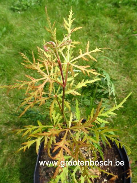 frisgeelgroene dissectum met oranje gloed in voorjaar. De hoogte na 10 jaar is 200cm. De bladkleur is geelgroen.
